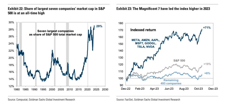 나는 이 시점에서 미국의 경제가 과열이라고 생각한다. 분명 나는 현 상태가 AI 버블이라고 생각한다. 소위 M7이라고하는 빅테크 기업들의 2023년 기준으로 Market Cap이 전체 시장의 대략 30%를 차지하고 있다.